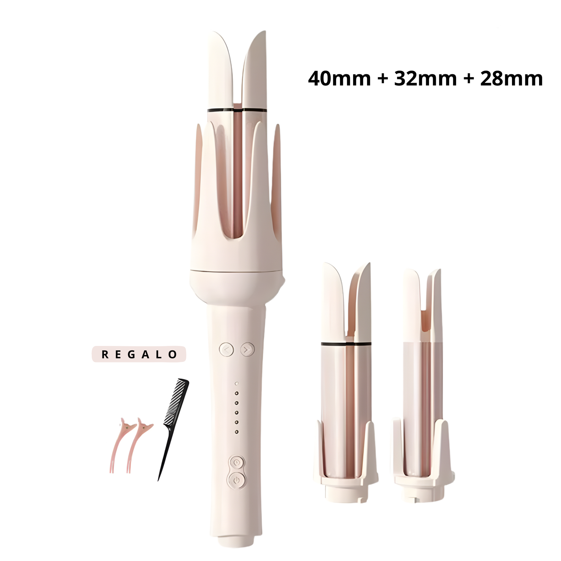 Accesorios incluidos: 28 mm (definidas) · 32 mm (natural) · 40 mm (playa) · peine alisador.